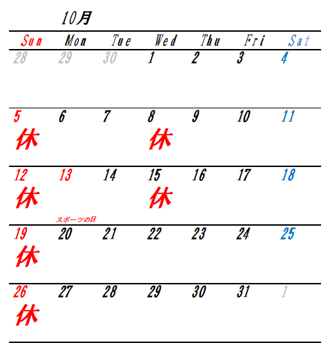 10月のお休みです。